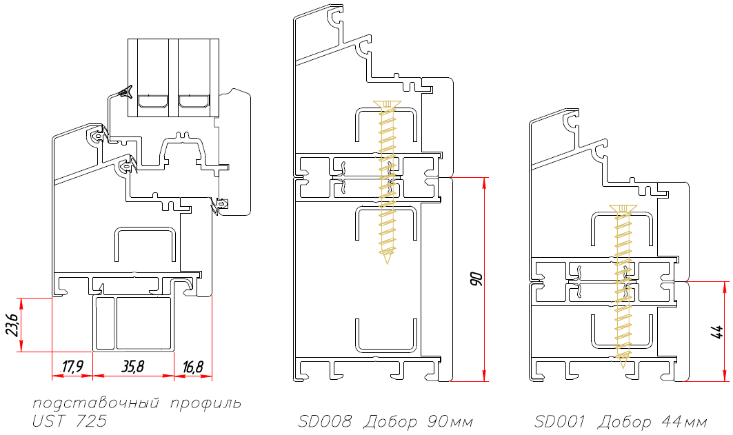 Система TRIFORM в сборе с подставочным профилем UST 725, расширителями(доборами) 44(SD001) и 90(SD008) мм
